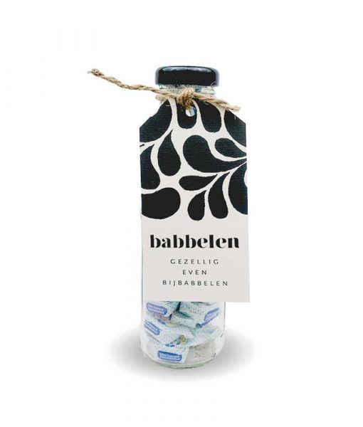Daaraan een mooi zwart/wit label met de tekst Babbelen, gezellig even bijbabbelen.