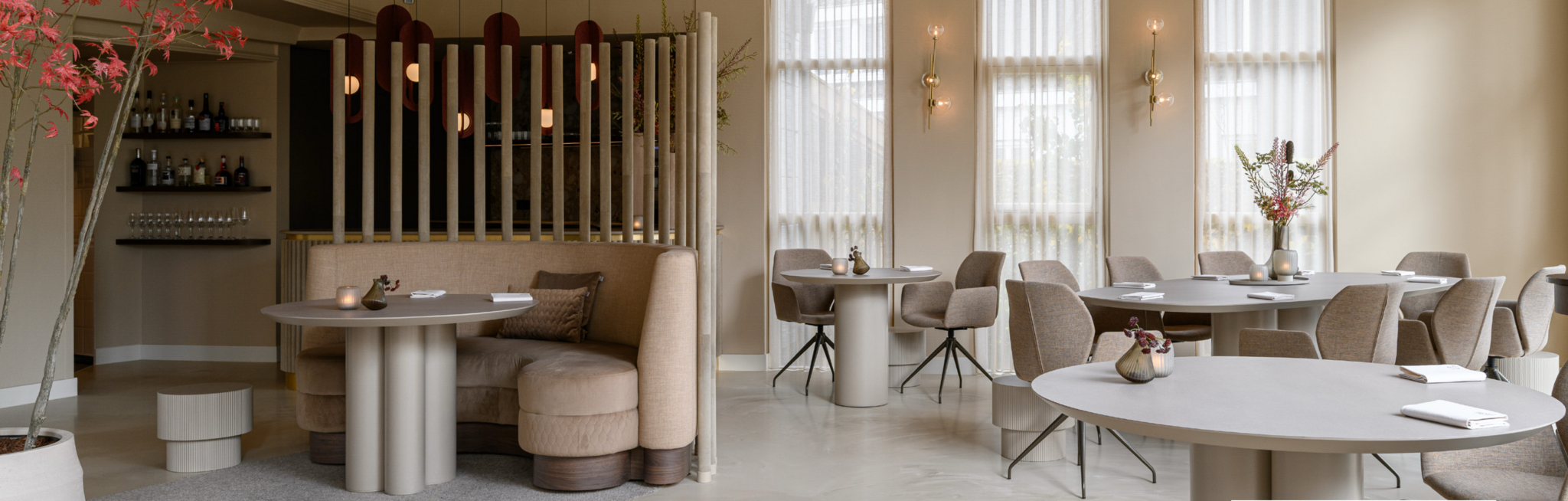De collectie bestaat uit stoelen, ronde banken en tafels, zorgvuldig ontwikkeld voor zowel particuliere interieurs als professionele horecatoepassingen. Elk meubel is samengesteld met hoogwaardige meubelstoffen — brandvertragend, vlekbestendig en duurzaam — zodat esthetiek en functionaliteit moeiteloos samengaan.